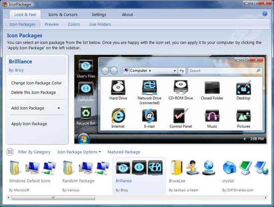 Bạn chỉ cần đơn giản vào WinCustomize.com và download một trong các gói biểu tượng theme, các gói đã được gói như một file đơn lẻ. Ứng dụng IconPackager có diện mạo và hành vi giống như hầu hết các thành phần khác trong bộ Object Desktop, một giao diện đơn giản và mang tính trực giác cao cho việc chọn ra gói biểu tượng đã được cài đặt mà bạn muốn sử dụng.