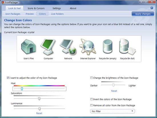 Bạn có thể xem nhanh trước các biểu tượng trong mỗi gói và hầu hết chúng đều cho phép bạn điều chỉnh màu sắc, độ sáng, độ chói,… Các tính năng này còn hữu dụng hơn những gì bạn được biết về chúng. Kiểu điều khiển trên những gì nhìn thấy từ tập các biểu tượng làm cho nó trở nên dễ dàng hơn nhiều trong việc chọn các biểu tượng bóng bẩy mà bạn thích. Thêm vào đó bạn cũng có thể tùy chỉnh bất cứ một gói biểu tượng nào, thay thế các biểu tượng riêng rẽ bằng các biểu tượng khác từ các tập khác hoặc các biểu tượng Windows chuẩn.