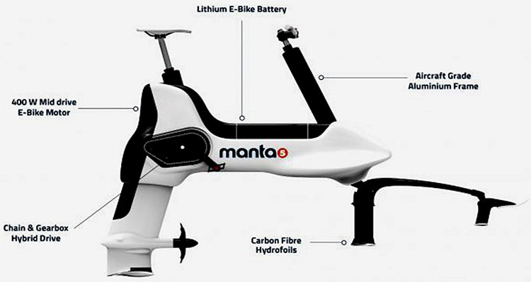 Ngoài ra, để giúp cho người sử dụng muốn nghỉ ngơi khi mệt, Manta5 đã trang bị thêm cho Hydrofoiler XE-1 một động cơ điện công suất 400 W và khối pin cho phép hoạt động liên tục gần 90 phút. Người dùng có thể điều chỉnh thông qua một màn hình HUD để chọn chế độ chạy điện hoàn toàn hoặc hỗ trợ đạp xe.
