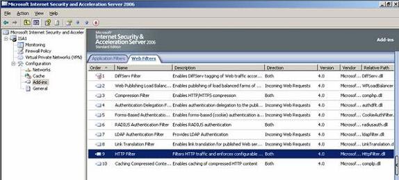 Bạn sẽ thấy trong ảnh minh họa bên dưới thành phần bổ sung Add-in của HTTP Filter trên ISA Server 2006.