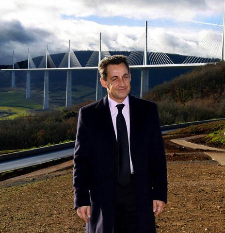 Tổng thống Pháp, Nicolas Sarkozy chụp ảnh lưu niệm bên cây cầu Millau nổi tiếng