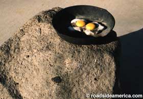 Sau khi những cơn gió mạnh đánh sập chiếc nhiệt kế và phá hủy một cửa hàng lưu niệm đang xây dựng, nó đã được xây dựng lại với phần lõi bên trong được nhồi bêtông để có thể chịu đựng được mọi biến động của thời tiết. Ngay bên cạnh chiếc nhiệt kế - một chứng nhân của nhiệt độ khí hậu địa phương - là kiến trúc vĩnh cửu của hình tượng một chiếc chảo chiên trứng. Chiếc nhiệt kế của thị trấn Baker không có đối thủ cạnh tranh thực tế.