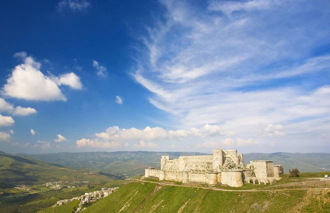 Lâu đài Krak des Chevaliers, Syria. Krak des Chevaliers là một trong số những lâu đài quan trọng nhất Syria và đóng vai trò như một trung tâm hành chính cũng như một căn cứ quân sự. Với khả năng phòng thủ và vị trí bất khả xâm phạm, lâu đài khổng lồ nằm trên đỉnh đồi là một trong những lâu đài quân thập tự chinh tốt nhất vẫn còn tồn tại. Đây là một trong sáu di sản văn hóa thế giới của Syria được UNESCO công nhận. Đây được xem là một trong những tàn tích đẹp nhất của một thành phố La Mã trên thế giới.