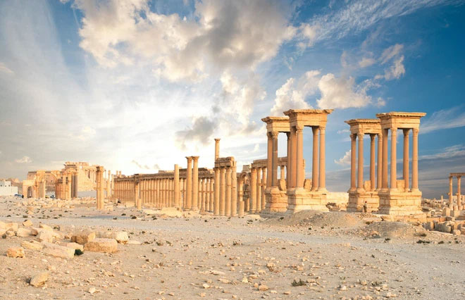 Thành phố cổ Palmyra, Syria. Là một trong những kho báu khảo cổ bị phá hủy trong nội chiến Syria, tàn tích của thành phố cổ Palmyra ở tỉnh Homs chưa thể thể trùng tu đến hiện tại. Nghệ thuật và kiến trúc của thành phố sa mạc Syria là sự kết hợp giữa văn hóa Graeco - La Mã với truyền thống địa phương và ảnh hưởng của văn hóa Ba Tư. Nội chiến Syria khiến quá trình tái thiết Palmyra vẫn đang bị đình trệ.