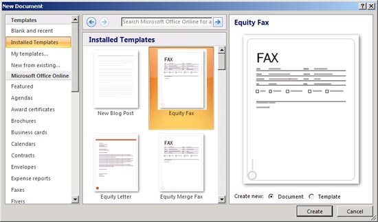 Tạo một tài liệu mới từ mẫu có sẵn: Nhấn Microsoft Office Button , chọn New. Nhấn Installed Templates, sau đó chọn một mẫu đã cài vào máy hay chọn một mẫu từ Microsoft Office Online (yêu cầu có kết nối Internet để tải về). Nhấn nút Create để tạo một tài liệu mới từ mẫu đã chọn.