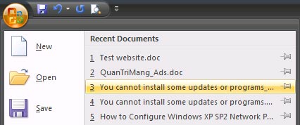 Bạn hãy để ý, ở góc trên bên tay trái có một nút hình tròn , nó có tên là Microsoft Office Button. Nhấn nút này sẽ xuất hiện một bảng lệnh tương tự như menu File của phiên bản Word trước, bao gồm các lệnh: New, Open, Save, Print...