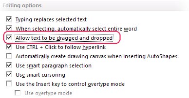 - Bên dưới nhóm Editing options, bạn đánh dấu kiểm mục Allow text to be dragged and dropped. Nhấn OK.