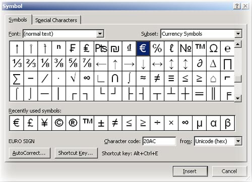Chèn một ký tự Unicode từ hộp thoại Symbol
