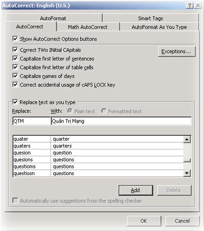 Để sử dụng được tính năng này, trước hết bạn cần bật AutoCorrect lên: