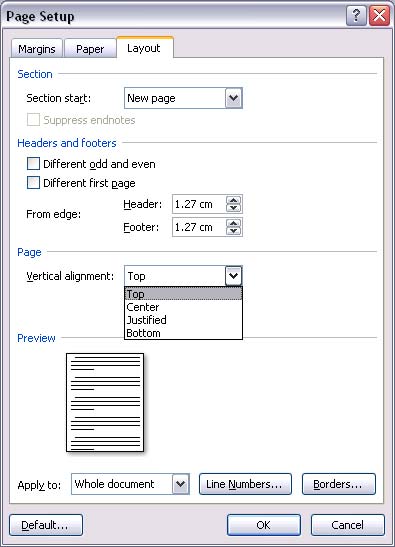 2. Trong hộp thoại Page Setup, nhấn vào thẻ Layout. Tại mục Vertical alignment, bạn chọn một loại canh chỉnh mình thích (Top, Center, Justified, Bottom).