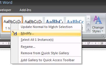 1. Trong thẻ Home, nhóm Styles, nhấn chuột phải vào nút Normal, chọn Modify.