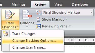 - Bạn có thể đổi màu và những định dạng mà Word dùng để đánh dấu sự đổi trong tài liệu bằng cách nhấn vào mũi tên bên cạnh nút Track Changes, và nhấn chọn mục Change Tracking Options.