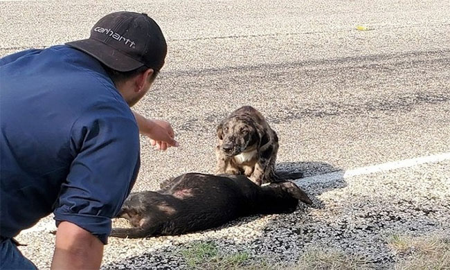 Con chó ngồi lỳ bên đường để trông coi xác đồng loại bị chết do tai nạn và không chịu để nhân viên cứu hộ tới gần.