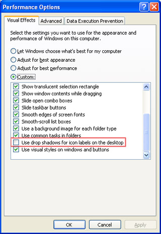 Bỏ dấu kiểm trước ô: Use drop shadows for icon labels on the decktop, nhấn Apply rồi OK.