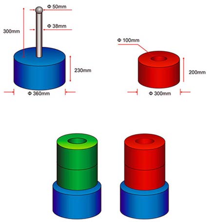 Viên ngọc có hình trụ rỗng làm bằng xốp cứng, sơn màu đỏ (Red) dành cho đội đỏ và màu xanh (Green) dành cho đội xanh (đường kính trong 100mm, đường kính ngoài 300 mm, cao 200 mm, trọng lượng 300 g). (Chi tiết xem bản vẽ)