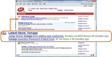 | Bạn sẽ có được các liên kết đến những tin bài gần đây có liên quan đến truy vấn ở đầu trang kết quả khi dùng Ask.com |