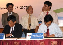 Ông Nguyễn Quang Thắng (người ngồi bên phải), đại diện VTV đang ký vào bản thỏa thuận |