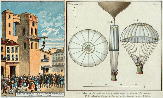 Minh họa cú nhảy dù của Louis-Sébastien Lenormand tại tháp Tour de la Babotte (trái) năm 1783 và thiết kế dù của André Garnerin năm 1797 (phải). (Ảnh: Amusing Planet).