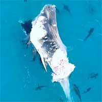 Thước phim quay bằng drone cho thấy một đàn cá mập san hô tranh nhau xé xác cá voi lưng gù (Megaptera novaeangliae) trôi nổi dọc vùng ven biển Australia.