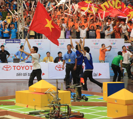 Các thành viên đội LH LED thể hiện sự vui mừng sau khi giành chiến thắng trong trận chung kết Robocon 2010. Ảnh: ATT. |