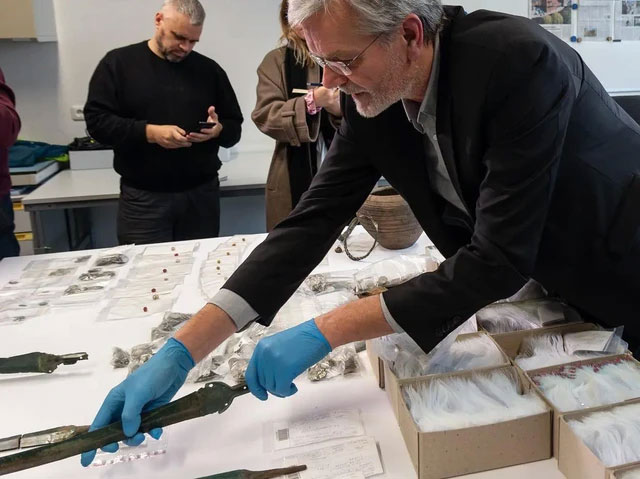 Thông báo từ Văn phòng Bảo tồn văn hóa và di tích nhà nước (LAKD) của Đức, kho báu thứ nhất gồm 7 thanh kiếm 3.000 năm tuổi, có thể được dùng như vật tùy táng hoặc hiến tế trong thời đại đồ đồng.