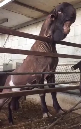 Hiệp hội dê Ai Cập chia sẻ hình ảnh của một con dê trông như khủng long với chiếc đầu đồ sộ, phần trán lớn và nếp da nhăn dưới miệng, thu hút 754.000 lượt chia sẻ trên Facebook, Sun hôm 22/3 đưa tin. Trong video, con dê đứng trên hai chân sau và bám vào rào chắn, nhìn ngó quanh chuồng. Kích thước của nó khiến những con dê cùng chuồng khác trở nên bé nhỏ.