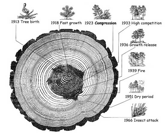 Cũng bằng cách đó, thực vật kể cho chúng ta về "gia phả" của mình tính từ lúc mới nảy mầm cho đến khi bị đốn hạ và rồi trở thành đồ gỗ thông dụng. Đương nhiên, cách đếm - tính các thớ khoanh vòng cây lại không phải là một điều dễ dàng, luôn đòi hỏi thứ công việc nhẫn nại với kính hiển vi và trên hết là tầm tri thức uyên bác về thế giới thực vật, bởi mỗi loài cây khác nhau lại có một đặc thù không hẳn như nhau. Loài cây lá nhọn như bách, thông, tùng... dễ "đếm" hơn là các loài họ dương...
