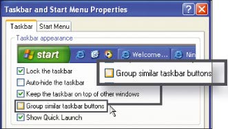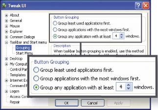 Tạo nhóm theo ý riêng: Bạn có thể nhận thấy ích lợi từ việc lập nhóm khi thanh tác vụ của Windows XP thật sự "đông đúc". Hãy đánh dấu tùy chọn Group similar taskbar buttons (cách thực hiện như phần trên), nhưng sau đó sử dụng thêm tiện ích Tweak UI for Windows XP của Microsoft. Khi cài đặt xong, khởi chạy tiện ích này, nhấn chuột vào dấu + cạnh mục Taskbar and Start menu ở khung cửa sổ bên trái (hoặc nhấn đúp chuột vào đó) và chọn Grouping. Trong khung cửa sổ bên phải, chọn cách hành xử phù hợp với nhu cầu sử dụng và nhấn OK (Hình 3).