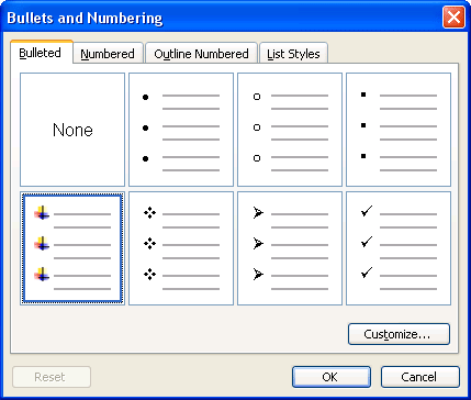 * Kích vào nút Customize… để chỉnh lại định dạng ký tự đầu dòng, xuất hiện hộp thoại mới Customize Bulleted List: