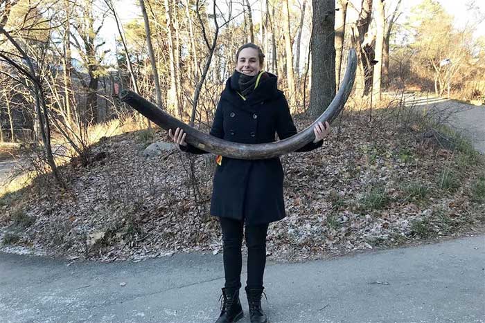 Nhà di truyền học tiến hóa Marianne Dehasque với chiếc ngà của voi ma mút ở Stockholm, Thụy Điển. (Nguồn: Reuters).