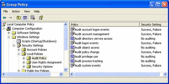Các thiết lập này sẽ giới hạn phạm vi tác động của tài khoản Administrator trên máy tính hay trên mạng. Chúng không ngăn cản người dùng có đặc quyền admin cấu hình quyền truy cập. Trong trường hợp này bạn cần thiết lập chế độ kiểm soát cả hai kiểu cấu hình của Administrator, cũng như khi tài khoản này được dùng để đăng nhập và sử dụng User Rights. Các cấu hình này được hoàn chỉnh với việc sử dụng GPO. Bạn có thể tìm thấy chúng trong Computer Configuration > Windows Settings > Security Settings > Local Policies > Audit Policy như Hình 4.