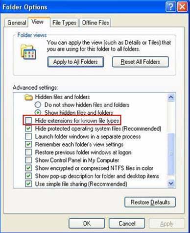Vị trí của tùy chọn tắt hiển thị phần mở rộng của tập tin
