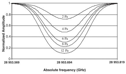 Hình 2. Phổ hấp thụ ở các giá trị áp suất khác nhau (Theo Phys. Rev. Lett. 98 250801).