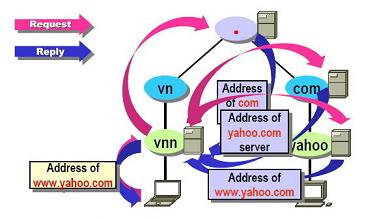 - Cuối cùng là server vnn gửi lại địa chỉ IP của server quản lý www.yahoo.com. cho PC A và PC A kết nối trực tiếp đến nó. Và bây giờ thì server vnn đã có thông tin về www.yahoo.com cho những lần truy vấn đến sau của các client khác.