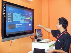 Nhân viên kỹ thuật Alcatel đang trình diễn dịch vụ Triple Play trên màn hình TV. (Ảnh: VNN) |