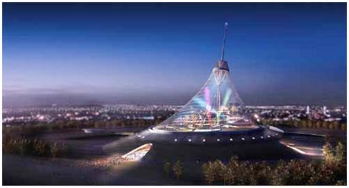 Được xây dựng bằng vật liệu ETFE, Trung tâm giải trí Khan Shatyry, cao 150m rộng 30.000m2 hình chiếc lều, ở Thủ đô Astana của Kazakhstan dự kiến hoàn thành vào năm tới. (Ảnh: gizmodo.com) |