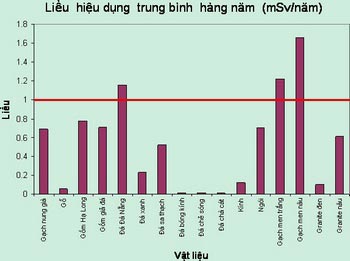 Nếu tính ra liều hiệu dụng trung bình hàng năm thì một số lọai vật liệu xây dựng như gạch men nâu, đá Đà nẵng, gạch men trắng, gốm giả đá, gốm Hạ long và một vài lọai vật liệu khác gây ra liều hiệu dụng cao hơn so với trung bình của thế giới. Cụ thể, gạch Đà Nẳng có hàm lượng phóng xạ là 1,16 mSV/năm; gạch men trắng: 1,22 mSv/năm; gạch men nâu: 1,66mSv/năm; granite nâu: 0.61 mSv/năm. Trong khi đó, giá trị liều giới hạn theo qui định chung trên thế giới là 1mSv/năm.