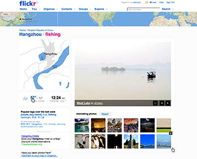 Trang Maps bao gồm hơn 70.000 địa điểm mà Flickr xác định. Còn trang Places giúp người dùng thám hiểm một khu vực bằng cách nhấn chuột vào những thẻ thông tin phổ biến, ảnh đẹp, "phó nháy", bộ sưu tập ảnh về các địa danh... Đây là bức ảnh gắn thẻ "fishing" cho vùng Hàng Châu (Trung Quốc).