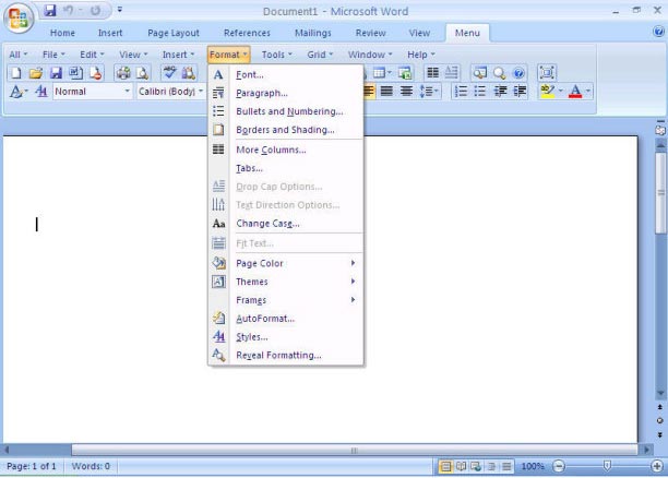 Menu quen thuộc của Office trong Word 2007
