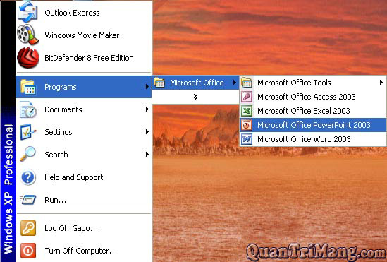 Kích vào nút Start, chọn Programs, tiếp đó chọn Microsoft Office và kích vào Microsoft Office PowerPoint 2003.