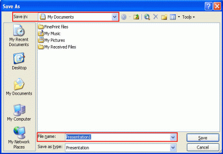 Chúng ta hãy để “presentation” cho tên file đầu tiên, kích vào nút Save để lưu lại. Chú ý: Lúc này file được ghi ở thư mục My Documents.