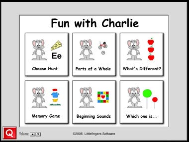 Chương trình có dung lượng 9,2 MB, bạn có thể tải bản dùng thử 6 lần về từ địa chỉ http://www.little-g.com/sware/CHARLIE.EXE. Chương trình sẽ cung cấp cho các bé 6 loại hình trắc nghiệm khá lý thú bao gồm: Ee (đoán từ đồng nghĩa), Parts of a whole (đoán bộ phận của từng hình ảnh), What’s Different? (tìm sự khác nhau giữa các hình ảnh), Memory (kiểm tra trí nhớ của trẻ), Beginning Sound (đoán từ đầu tiên của một từ) và Which one is (kiểm tra độ nhanh nhẹn của trẻ).