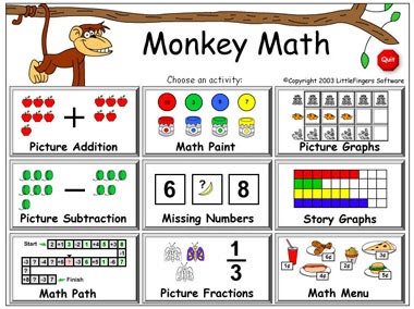 Chương trình MonkeyMath có dung lượng 8,5 MB còn PICMATH có dung lượng 3,3 MB. Bạn có thể tải bản dùng thử 6 lần từ địa chỉ: http://www.little-g.com/sware/MonkeyMath.exe và http://www.little-g.com/sware/PICMATH.EXE. Đây là hai chương trình học toán khá lý thú với các bài tập thích hợp cho độ tuổi 8-12. Không đơn thuần các con số khô khan, 2 chương trình này cung cấp các bài tập toán đã được “hình ảnh” hóa nên sẽ khiến trẻ cảm thấy việc giải toán nhẹ nhàng như đang chơi một trò chơi nho nhỏ.