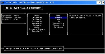 Sau khi kích hoạt chương trình bạn sẽ thấy một menu, bạn có thể lựa chọn đọc các thông tin về phần mềm hoặc cũng có thể chọn ngay tùy chọn “Crackers” trên menu và lựa chọn kiểu BIOS bằng cách sử dụng mũi tên lên hoặc xuống và phím Enter. Bạn sẽ không thể dùng chuột bởi chương trình này hoạt động dựa trên các dòng lệnh trong môi trường DOS. Nếu bạn không rõ mình đang sử dụng loại BIOS nào thì cách đơn giản nhất là chọn và thử tất cả các loại BIOS có trong danh sách. (Điều này sẽ không làm tổn hại đến hệ thống)