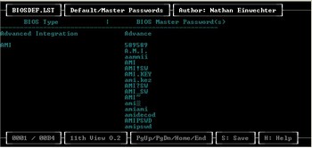 Chương trình cũng có cung cấp 1 vài mật khẩu “cao cấp” của 1 số phiên bản BIOS (mật khẩu mặc định để truy cập các BIOS). Bạn có thể truy cập vào menu Docs -> Passwords và nhấn Enter. Danh sách các mật khẩu tương ứng với các phiên bản BIOS sẽ được hiển thị.