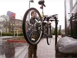 Stephen Weis, kỹ sư phần mềm của Google đang gác xe đạp lên giá để xe bên ngoài xe buýt. |