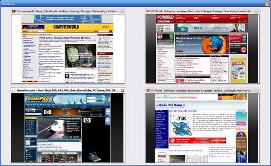 FireFox Showcase là thành phần mở rộng tuyệt vời, bởi sự tiện lợi cũng như việc sử dụng một chức năng nâng cao của Internet Explorer 7 trong FireFox: hiển thị tất cả cửa sổ nhỏ của các chương trình và tab đang mở.