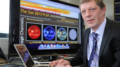 Volker Bothmer, ngồi bên máy tính với những ảnh chụp mặt trời khác nhau của vệ tinh "SDO" (Solar Dynamics Observatory). (Ảnh: wiwo.de)