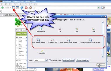 Bạn có thể dễ dàng tạo shortcut cho Firefox Showcase để truy xuất nhanh khi cần, thay vì phải vào menu View bằng cách: Vào menu View > Toolbars > Customize. Kéo và thả các biểu tượng bắt đầu bằng dòng chữ Showcase vào bất kỳ chỗ nào mà bạn muốn đặt nó trên thanh Toolbar của Firefox (xem hình 2).
