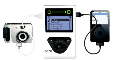 Chỉ cần kết nối mỗi thiết bị qua những dây cắm USB với Hitch (camera kỹ thuật số, máy nghe nhạc MP3, ổ cứng di động) và thế là bạn đã sẵn sàng để chuyển file. Hitch có một màn hình xanh hiển thị menu cho phép bạn lựa chọn những tài liệu nào cần chuyển sang thiết bị nào. Vì thế bạn không cần chờ đợi để về nhà có máy tính mới chuyển được file.